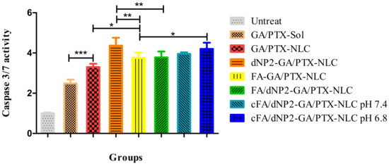 The results of previous studies have shown that the combination of GA and PTX exhibited more apoptotic cells than the single drug in tumor tissues of mice, and the induction effect of GA and PTX encapsulated with NLC on the apoptotic death of cancer cells was significantly greater than that of solution [7]. As caspases are responsible for the execution of apoptosis, the activation of caspase was detected using a caspase activity kit. As shown in Figure 8, the treatment of GA/PTX-Sol resulted in increased caspase 3/7 activity (2.4-fold to control) in 4T1 cells. When GA and PTX were loaded by NLC, the caspase 3/7 activity (3.3-fold to control) was further increased, and the caspase-3/7 activities of 4T1 cells were increased by 4.3-, 3.7-, 3.7-, 3.9-, and 4.2-fold after 24 h treatment of dNP2-GA/PTX-NLC, FA-GA/PTX-NLC, FA/dNP2-GA/PTX-NLC, cFA/dNP2-GA/PTX-NLC (pH 7.4), and cFA/dNP2-GA/PTX-NLC (pH 6.8), respectively compared with the control group.