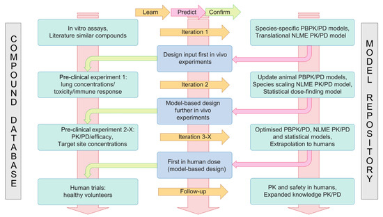 Based on the two case studies described in this concept paper, we propose a model-informed platform, described in Figure 1, which takes into account the specificity of immunomodulatory drugs and can be used as a blueprint for drug development in this area. The driving force of the framework is the well-known “learn–predict–confirm” paradigm [], where iteratively more complex models are used to weigh, model, and apply data as they become available. This paradigm should be applied to the standard of care that is considered, i.e., the PK/PD of the antibiotic that is to be combined with the immunomodulatory drug, and to the new (immunomodulatory) drug under development. Based on the built-in Bayesian approaches, the consistency of input data with extrapolated results can be assessed continuously, which allows early-on detection of, e.g., model misspecification. At the beginning of a drug development project, a small amount of information with high uncertainty is available, allowing only for simple pharmacometric models combined with non-informative priors in a Bayesian inference framework. As these models are used to design further experiments, confidence in model structure increases as data become available and priors are updated using posterior distributions of previous analyses and/or external data. As the project continues, a knowledge database for the compound is constructed, and a model repository of increasingly more complex models is created. For example, with more data available, basic allometric scaling approaches can be complemented by mechanistic models, such as physiologically based pharmacokinetic models. Bayesian posterior and/or predictive probabilities then aid in applying these pharmacometric models to obtain starting dose levels for human studies. This continues into the clinical phase, where all generated knowledge is used to propose a first-in-man dose, which still persists within the framework and is thus also uncertain and can be updated as more data become available. Furthermore, models describing the emergence of AMR as a function of (antibiotic) exposure and infection duration (influenced by the immunomodulator) could be added to this framework to quantify the impact of a proposed new combination therapy on the global AMR dynamics []. Indeed, by modulating the immune response, the so-called mutant selection window can be narrowed, and linking the immunomodulator model to a model describing the PK/PD of antibiotics and a bacterial growth model with multiple populations, the impact on resistance emergence could be quantified [,].