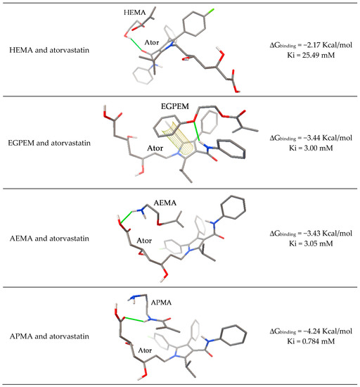 AutoDock modeling of structural and functional monomers–atorvastatin (Ator) interactions and the respective estimated free energy of the binding and inhibition constant. In the structures, N atoms are shown in blue, oxygen atoms in red, and the main bond interaction is shown in green.