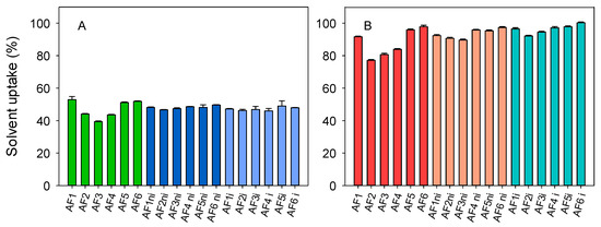 Solvent uptake (%) in (A) simulated lachrymal fluid and (B) atorvastatin calcium solution (0.04 mg/mL in ethanol:water 20:80 v/v) for all hydrogels before sterilization. Codes as in Table 1 (n = 4; mean values and standard deviations).