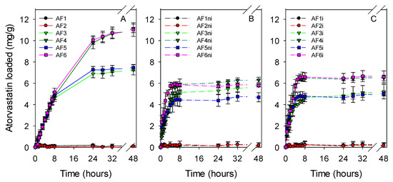 Hydrogel discs were dried and immersed in atorvastatin solution (0.04 mg/mL in ethanol:water 20:80 v/v) to quantify the drug loading ability (Figure 4). Nonfunctionalized hydrogels did not uptake any atorvastatin (AF1, AF1ni, and AF1i). Predictably, the amount of atorvastatin loaded increased with the content in APMA and AEMA functional monomers. The hydrogels with larger content in functional monomers required more than 24 h to complete the sorption, while the other nonimprinted and imprinted hydrogels completed the loading in the first 8 h. Addition of EGPEM did not further improve the loading (code AF2). The uptake was remarkably higher for hydrogels prepared with APMA (AF4, AF6, AF4ni, AF6ni, AF4i, and AF6i), which had the highest affinity for atorvastatin. Imprinted hydrogels showed minor increases in the amount of atorvastatin loaded compared to nonimprinted ones, which is typical of drugs in which one-point interaction prevails over other feasible interactions [66].