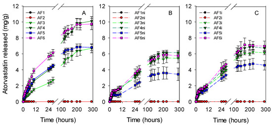 To gain further insight into the effects of the sterilization technique on the hydrogel structure, the FTIR–ATR spectra of AF1, AF6, AF6ni, and AF6i dried discs before and after SH and HPP sterilization were compared (Figure S4 in Supplementary Materials). The spectra were normalized taking as a reference the main absorption peak of HEMA at 1704 cm−1, corresponding to the C=O band [75]. AF1, which lacks functional monomers, showed the typical bands of pHEMA networks with strong intensities at 1483 (CH2), 1367 (CH2), 1153, and 1073 (C–O–C) cm−1. Relevantly, none band of AF1 was altered after sterilization by either steam heat or HHP. The spectra of nonsterilized AF6, AF6ni, and AF6i evidenced a relative increase in the bands at 1367, 1153, 1073, and 965–938 cm−1, which can be attributed to the copolymerization with APMA. Relevantly, the sterilization did not cause significant changes in the spectrum bands with respect to the nonsterilized discs. Unfortunately, FTIR spectra were not useful to analyze atorvastatin–hydrogel interactions probably because of the relatively low content in the drug.