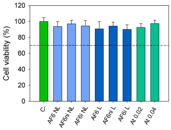 Viability of Balb/3T3 cells (%; mean and standard deviations) determined by CCK-8 assay, after 24 h exposure to nonloaded (NL), and atorvastatin loaded (L) hydrogels (AF6, AF6ni and AF6i) and two atorvastatin solutions (At; 0.04 and 0.02 mg/mL in ethanol:water 20:80 v/v). Negative control (C-) cells cultured in the absence of any treatment. Dashed line corresponds to 70% cell viability.