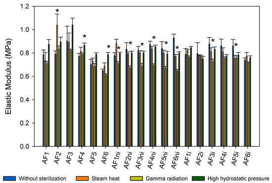 Elastic modulus (MPa) obtained for all hydrogels hydrated with 0.9% NaCl before and after each sterilization method. (*) Statistically different from the nonsterilized hydrogels (Kruskal–Wallis test and Games–Howell post hoc test, p < 0.05).