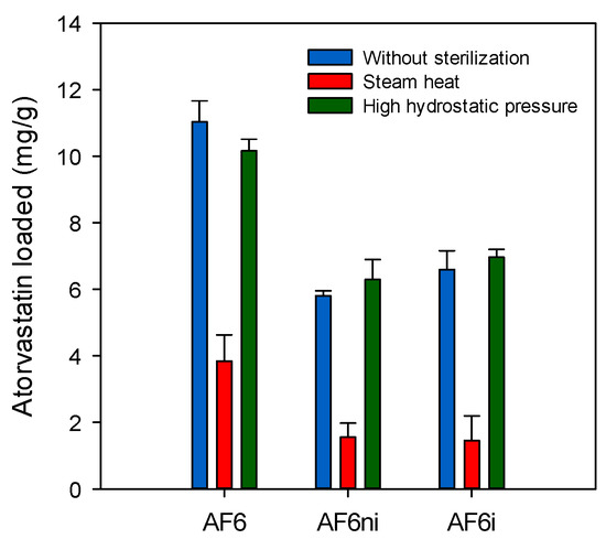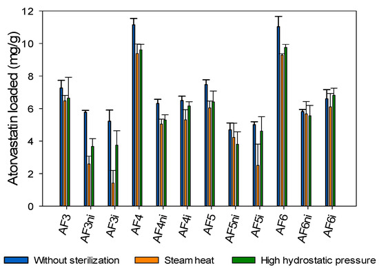 Atorvastatin loaded by AF6, AF6ni, and AF6i hydrogels when they were sterilized in drug solution by means of steam heat or high hydrostatic pressure, compared to nonsterilized hydrogels.