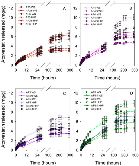 Comparison of atorvastatin release profiles from hydrogels that had not been sterilized (WS) and hydrogels that had been sterilized by high hydrostatic pressure (HHP) before loading. (A) F3 series, (B) F4 series, (C) F5 series, and (D) F6 series. Codes as in Table 1 (n = 4; mean values and standard deviations).