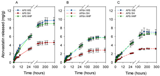 Comparison of atorvastatin release profiles in SLF from AF6 (A), AF6ni (B), and AF6i (C) hydrogels that had not been sterilized (WS) or that were sterilized during loading (immersed in drug solution) by means of steam heat (SH) or high hydrostatic pressure (HHP). Codes as in Table 1 (n = 4; mean values and standard deviations).