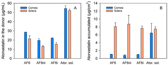 Regarding the concentration of atorvastatin in the donor chamber after 6 h of experiment, these values were 28.43 ± 0.43 µg/mL for AF6, 19.67 ± 1.68 µg/mL for AF6ni and 22.00 ± 0.51 µg/mL for AF6i for cornea tissue (Figure 12A). For scleral tissue, the concentration of drug in the donor chamber was significantly lower for all hydrogels (21.32 ± 3.40 µg/mL for AF6; 13.17 ± 0.63 µg/mL for AF6ni; and 15.46 ± 1.81 µg/mL for AF6i; ANOVA, p < 0.05). In the case of the control solution, the concentration of atorvastatin remaining in the donor chamber was still significantly high in contact with cornea and sclera tissues (54.31 ± 2.98 and 52.11 ± 0.64 µg/mL, respectively) and, in all cases, greater than that recorded for the hydrogels (ANOVA, p < 0.05).