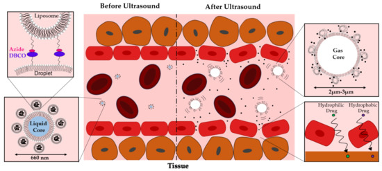 PCAs may be a better candidate for drug delivery applications due to their smaller size and longer-circulation times [34,35,36,37] and tunable vaporization thresholds [38] PCAs contain a superheated liquid perfluorocarbon (PFC) core. When exposed to heat or acoustic energy, the liquid PFC core vaporizes to form a gas microbubble [36,39,40,41]. This rapid liquid–gas phase transition can apply substantial shear forces to the surrounding boundaries [42,43,44], which makes them useful agents for permeabilizing tissue and promoting drug uptake [45]. One of the main advantages of PCAs is the ability to encapsulate PFC soluble compounds in the core, such as doxorubicin, for simultaneous imaging and therapy [46]. More recent research has shown that systemic drug release from the core of circulating nanodroplets can be achieved without inducing damage to surrounding blood vessels [47]. Although this exciting strategy has shown promising results [48], many drugs of interest are only minimally soluble in PFC. More efficient and versatile methods of drug loading or encapsulation would substantially improve on ultrasound-based drug delivery strategies.