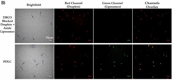 Our initial aim of the study was to demonstrate a facile method of producing PDLCs using a single-step strain-promoted [3 + 2] azide-alkyne cycloaddition (SPAAC) click chemistry approach, motivated by Slagle et al. [59]. Brightfield and fluorescent microscopy were used to visualize PDLCs and assess the binding efficiency of DBCO-Azide click chemistry 24 h after incubation (Figure 2). Liposome nanoparticles themselves cannot be seen using brightfield microscopy due to their small size and low index of light refraction. Therefore, no qualitative difference in negative control and PDLC sample was observed in brightfield microscopy. However, fluorescent microscopy showed that the co-localization of DiO labeled liposomes (green) and DiD labeled droplets (red) occurs in PDLCs sample, but not in the DBCO-blocked negative control (Figure 2B), indicating that the binding of liposomes occurs primarily due to DBCO-Azide chemistry.
