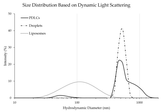 The size distribution of droplets, liposomes, and PDLCs. The clustering of droplets and liposomes increases the overall median diameter of the particles. Distributions are averaged from three sample measurements.