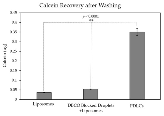 Calcein recovery after washing. Increased calcein recovery is observed in PDLC samples compared to liposomes (** p < 0.0001). DBCO blocking of droplets before clustering shows little non-specific binding indicated by the minimal increase in calcein recovery compared to liposomes alone.