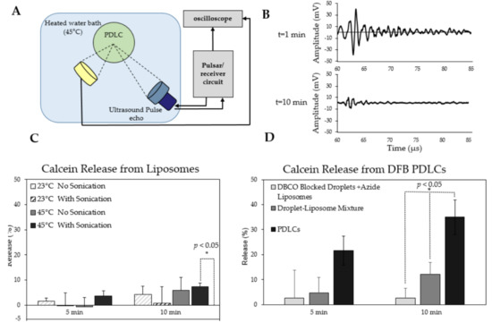 Calcein release from phase changeable droplet-liposome clusters (PDLCs) after 5 and 10 min of sonication (A) schematic illustration of the acoustic chamber setup used for measuring calcein release from PDLCs. (B) vaporization acoustic signals during and after vaporization used for visualizing the completion of droplet vaporization. (C) Effect of sonication and temperature on release from liposomes alone (no droplets). Only sonication at 45 °C showed a statistically significant release above zero (* p < 0.05). (D) Calcein release following US exposure. Release from PDLCs was significantly higher than any other group after 10 min (* p < 0.05). Release after 5 min was higher than the negative controls but not significantly. N = 3 per group.