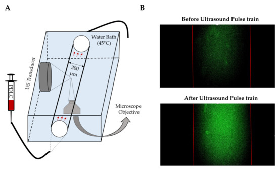 A custom chamber was developed to visualize drug release in a capillary tube, similar to the setup outlined by others [30,57]. A water bath contained within an acrylic chamber was placed onto an Olympus 1X-71 inverted microscope and heated to 45 °C using an immersion heater (Ulanet 324, Columbus, IN, USA). The PDLC solution was infused through a 200 μm-diameter cellulose capillary tube (Spectrum Laboratories, Irving, TX, USA) inside the bath, positioned on the focal plane of a 60X water-immersion objective (Olympus, Shinjuku, Tokyo, Japan). A 1.1 MHz ultrasound transducer (H-131 Sonic Concepts, Bothell, WA, USA) with a focal length of 35 mm was used to apply ultrasound pulses to PDLCs in the microscope’s field of view. The ultrasound transducer was driven by an arbitrary waveform generator (Picoscope5000 with AWG; Cambridgeshire, UK) with the RF signal amplified by a linear amplifier (ENI 2100L; Rochester, NY, USA). The PNP of the ultrasound pulses was measured using a needle hydrophone (HNC-0100; Ondacorp; Sunnyvale, CA, USA) attached to an oscilloscope (Picoscope5000). A single ultrasound pulse train (300 pulses total) was applied at 1.85 MPa PNP. A digital QImaging Optimos CCD camera (Surrey, BC, Canada) mounted on the inverted scope (1280 × 1280 resolution; 100 frames per second) was used to take the images. Application of ultrasound and image capture were synchronized using a custom LabVIEW program and data acquisition board (Arduino UNO) to delay the ultrasound pulse by 10 ms following the camera acquisition trigger. Digital images were displayed and processed using NIH ImageJ software and Micromanager acquisition software. Fluorescent images were acquired using a 100 W High Pressure Mercury Burner, Olympus (Shinjuku, Tokyo, Japan).