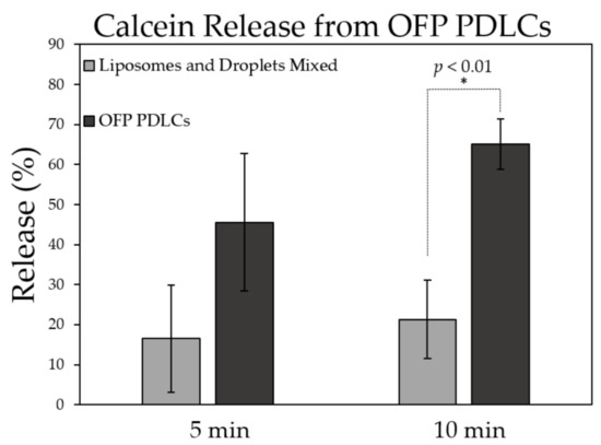 OFP-PDLCs were prepared as described in the methods section, similar to DFB PDLCs. Although the yield of PDLC production was much lower than DFB PDLCs (~10 times lower due to more spontaneous vaporization), the release rate for OFP PDLCs was 65% (+/−6.2) (Figure 8), which was higher than DFB PDLCs (65% vs. 35%). A t-test between the two groups showed a significant increase in release when OFP droplets are bound to liposomes (p < 0.01).