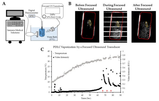 To visualize vaporization of OFP PDLCs following application of focused ultrasound, a commercial handheld therapeutic transducer (SoundCare Plus, Austin, TX, USA) coupled to a custom milled lens-and-cone was focused onto an acoustically transparent pipette bulb filled with 1 mL of 1× PBS that was submerged in a water bath maintained at 37 °C. B-mode imaging was performed simultaneously using an Acuson Sequoia 512 ultrasonography system (Siemens Medical Solutions, Erlangen, Germany), equipped with a linear 15L8 transducer. The focused ultrasound probe was powered at an intensity of 3 W/cm2 (corresponding to 2 MPa peak negative pressure in the focal zone) and a 10% duty cycle to insonify droplets as they were injected at 4 °C temperature into the pipette bulb. A T-type thermocouple probe (ADInstruments, Colorado Springs, CO, USA) was placed inside of the pipette bulb to monitor the PDLC solution temperature. Data was recorded using proprietary LabVIEW software. The sonication process started after PDLC solution reached 30 °C in which the transducer was on/off for 5 s each until all vaporized droplets disappeared from the field of view. To visualize the vaporization threshold, proper regions of interest (ROIs) were selected and the pixel intensities were measured in the ROI.