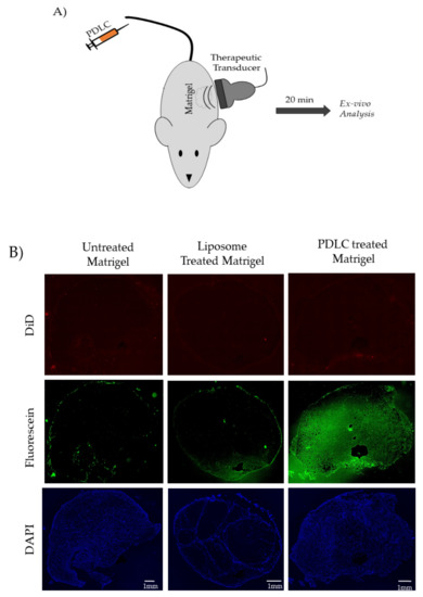 PDLCs were injected intravenously while keeping the syringe on a frozen ice pack. 30 s following the injection, implanted Matrigels™ were insonified (3 W/cm2) at 10% duty cycle by a therapeutic transducer as described earlier. Sonication was applied for 8 min, turning the transducer on/off every 5 s to allow reflow of fresh PDLCs. Matrigel™ plugs were surgically excised for ex vivo analysis 20 min after PDLC injection, as described by Bellary et al. [58]. Excised plugs were frozen using dry ice-cooled 2-methyl butane (Sigma Aldrich, St. Louis, MO, USA) and kept in tubes in freezer (−80 °C). Then, 24 h after freezing, the plugs were sectioned for imaging, and DAPI containing vectashield mounting medium (Vector Laboratories, Inc. Burlingame, CA, USA) was used to dye cell nuclei. Images were taken using an Olympus VS120 Virtual Slide Microscope. Data and images were analyzed using Olympus VS120 Virtual Slide Microscope. Fluorescein uptake in Matrigels™ treated with PDLCs was compared to Matrigels™ treated with liposomes alone and untreated Matrigels™. A total of 2 mg of fluorescein (encapsulated in liposomes) was injected into each mouse.
