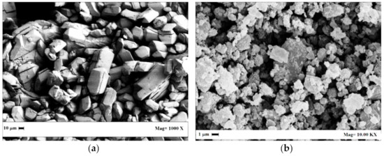 SEM images of the solid materials after the supercritical extraction process: (a) Fluni and (b) Fluti.