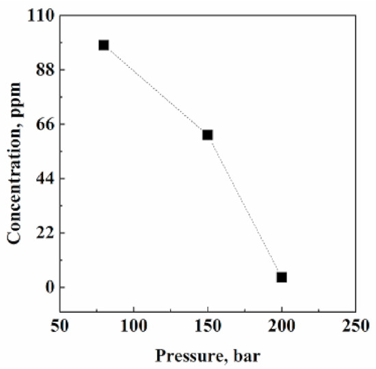 Figure 2 reports the final acetone residues measured in Fluni after SC-CO2 extraction performed at 80, 150, and 200 bar, and at 40 °C. Extraction efficiency largely increased with pressure, since, from 80 bar to 200 bar, the percentage of acetone removed from Fluni passed from 11% to about 96%. An explanation of this trend can be related to CO2 solvent power. Specifically, working at 40 °C and increasing pressure from 80 to 200 bar, CO2 density changes from 0.281 to 0.840 g/cm3, respectively. This strong increase in CO2 density largely increased the capability of CO2 to penetrate the API solid matrix and to solubilize the organic solvent, achieving a final acetone residual content of 4 ppm at 200 bar.