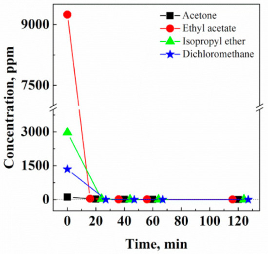 Figure 4 demonstrates that the residues of the four solvents detected in Fluni rapidly reached near zero ppm. In particular, after 40 min of supercritical extraction, solvent residue values were 4 ppm and 8 ppm for acetone and ethyl acetate, respectively, whereas isopropyl ether and dichloromethane residual contents were 0 ppm. The sum of all solvent residues after the treatment was 12 ppm.