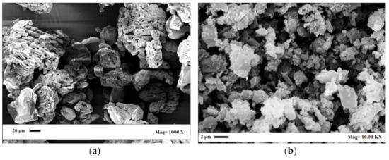 Flunisolide (Fluni) and fluticasone propionate (Fluti) raw powders were kindly supplied by Genetic SpA (Fisciano (SA), Italy). SEM images of these APIs are reported in Figure 1a,b; they showed an irregular morphology at the micrometric scale. Organic solvent residues were identified and measured using a gas chromatograph (GC) interfaced with a flame ionization detector (FID); these data are reported in Table 1. All solvent residues belong to Class 3 solvents (limit 5000 ppm) except dichloromethane, which is a Class 2 solvent, and its recommended limit is below 600 ppm [1]. The sum of Class 3 solvent residues in Fluni was larger than the general limit of 5000 ppm recommended for this category of solvents [1]; this limit was not respected even considering only ethyl acetate content (9244 ppm). In the case of Fluti, only acetone residue was detected at 326 ppm; its processing was useful to demonstrate the possibility to largely overcome the limits set by the other processing alternatives.