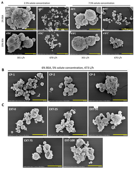 Figure 1. Scanning electron microscope (SEM) images of spray-freeze-dried powders. (A) The eight formulations prepared according to the factorial design; (B) the three center point formulations; (C) the five extended formulations. Scale bar: 30 µm.
