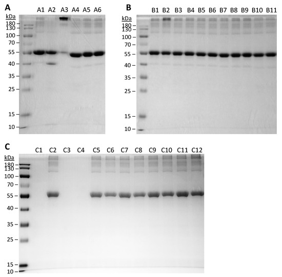 2.9. Protein Integrity by Sodium Dodecyl Sulfate-Polyacrylamide Gel Electrophoresis (SDS-PAGE)