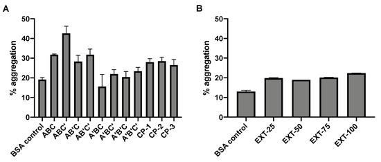 Figure 3. Protein aggregation of (A) factorial formulations and (B) extended formulations as determined by size exclusion chromatography (SEC). BSA control (unprocessed protein) was included as control. Data are presented as mean ± standard deviation (n = 3).