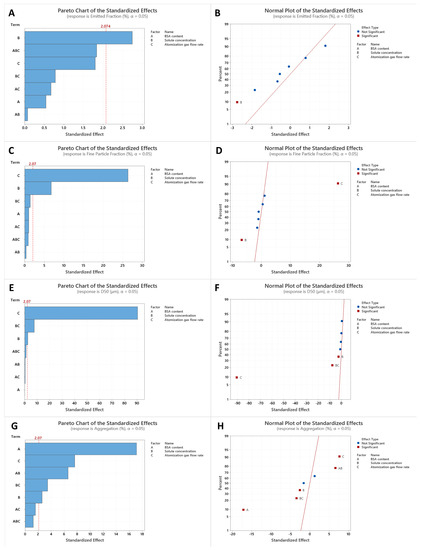Figure 4. Factorial design analysis of the spray-freeze-dried powder formulations. Pareto charts (A,C,E,G) illustrate the importance of the independent variables and their interactions on EF (A), FPF (C), volumetric diameter (E), and protein aggregation (G). The factors that cross the vertical reference line indicate that the effects are statistically significant. Normal probability plots (B,D,F,H) illustrate the magnitude, direction, and importance of the independent variables and their interactions on EF (B), FPF (D), volumetric diameter (F), and protein aggregation (H). Effects that are further from 0 are more statistically significant. EF: emitted fraction; FPF: fine particle fraction.