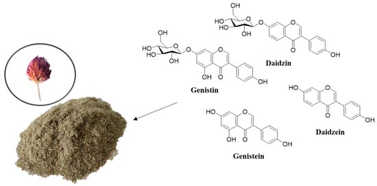 Trifolium pratense L. (red clover) (Figure 1) is a member of the family Leguminosae or Fabaceae. It is a short-lived biennial plant which has been used for its wide health benefits, which come from isoflavones [1]. The main isoflavones found in red clover are daidzein, genistein, formononetin, and biochanin A, as well as their glycosides (such as genistin, daidzin) [2,3].