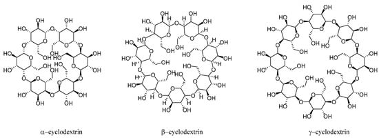 CDs are cyclic oligosaccharides composed of 6, 7, or 8 glucose units, named α-, β-, or γ-cyclodextrin, respectively (Figure 2) [18]. They have a rigid conical molecular structure with a hydrophobic interior and hydrophilic exterior. The internal cavity of these molecules can include a wide range of guest molecules, ranging from polar compounds, such as alcohols, acids, amines, and small inorganic anions, to non-polar compounds, such as aliphatic and aromatic hydrocarbons, while the hydrophilic exterior helps CDs to interact favorably with water [19].