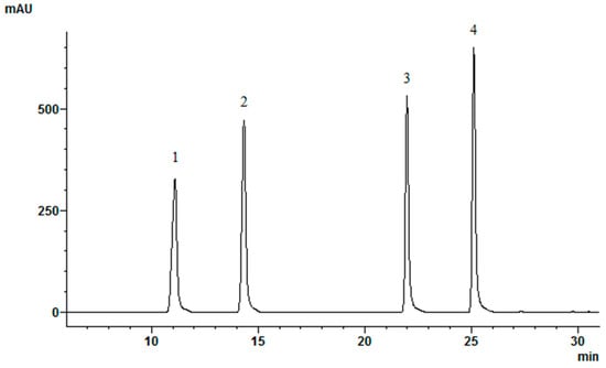 HPLC analyses were carried out using the Shimadzu Nexera X2 LC-30AD HPLC system (Shimadzu, Tokyo, Japan), consisting of a quaternary pump, an on-line degasser, a column temperature controller, the SIL-30AC autosampler (Shimadzu, Tokyo, Japan), equipped with the CTO-20AC thermostat (Shimadzu, Tokyo, Japan) as well as the SPD-M20A diode array detector (DAD). For the determination of polyphenols, an ACE 5 C18 250 × 4.6 mm column (Advanced Chromatography Technologies, Aberdeen, Scotland) was used. The mobile phase consisted of solvent A (acetic acid/methanol/deionized water) (1:10:89 v/v/v) and solvent B (acetic acid/methanol) (1:99 v/v/v). The linear gradient elution profile was as follows: 80% A/20% B at 0 min; 30% A/70% B at 30 min; 90% A/10% B at 39 to 40 min. The flow rate was 1 mL/min, and the injection volume was 10 μL. Absorption was measured at 260 nm. Quantification of isoflavone compounds was performed using reference standards of daidzein, genistein, daidzin and genistin. The linear calibration curves were constructed (daidzein R2 = 0.9999; genistein R2 = 0.9999; daidzin R2 = 0.9999; genistin R2 = 0.9999); the peak areas were used for quantification. Linear calibration curve functions were as follows: f(x) = 59664.2x + 37164.6 (daidzein), f(x) = 73083.1x + 44202.9 (genistein), f(x) = 38202.1x + 19377.4 (daidzin), f(x) = 49602.9x + 24083.3 (genistin). The contents were expressed as μg/g dry weight (dw). The range of linearity of daidzein: 0.43–221 µg/mL; genistein: 0.43–218 µg/mL; daidzin: 0.32–165 µg/mL; genistin: 0.3–151.5 µg/mL. Isoflavone separation HPLC-DAD chromatogram is provided in Figure 3.