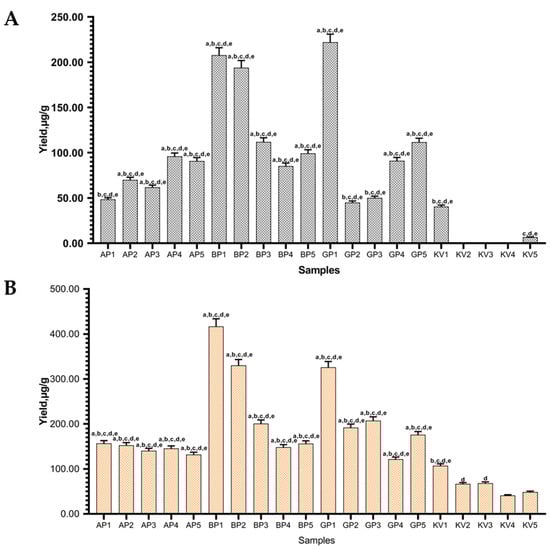 The highest aglycone yields were detected in sample B1 (258.67 ± 10.34 genistein and 290.33 ± 11.61 µg/g daidzein); the results were statistically significant compared with control samples. It was observed that using α- and β-CDs (A2-5 and B2-5 samples using α- and β-CDs, respectively) during UAE and extending the sonication time from 10 to 30 min resulted in increased aglycone yields. However, using γ-CDs (G2-3 samples) during UAE (with additional thermal hydrolysis) prolonged the processing time and reduced aglycone amounts in extracts (Figure 4A,B). Almost all of the samples (excluding A2, A3, A4 and B5 samples) showed higher extraction results (p < 0.05) than the control samples without excipients, and the use of the HRE method produced higher isoflavones extraction results than UAE (Figure 4A,B). Using only UAE, without thermal hydrolysis (samples A, B; G 4-5), showed poor (Figure 4A,B) but statistically significant results (compared with controls) in extracting daidzein (Figure 4A). To obtain higher yields of daidzein and genistein, thermal hydrolysis is a necessary step.