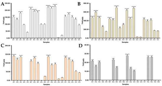 When using 50% of ethanol as a solvent, the highest yields of daidzein (p < 0.05) were detected in BE3 and GE3 samples using β-CDs and γ-CDs, respectively (Figure 6B). The highest yield of genistein was observed in sample GE3 (226.97 ± 9.08 µg/g) (Figure 6A), although similar results were obtained in samples GE1-2 and BE1. The genistein and daidzein contents in the BE3 sample were 184.30 ± 7.37 µg/g and 697.167± 27.88 µg/g; in the GE3 sample, they were 226.96 ± 9.07 µg/g and 682.90 ± 27.31 µg/g.