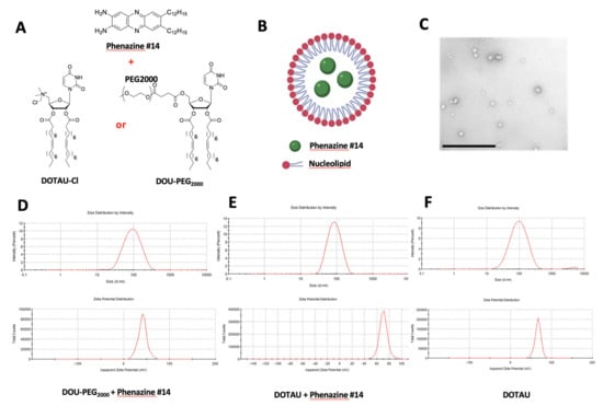 (A) Phenazine #14 formulation with DOU-PEG2000 (N-[5′-(2′,3′-dioleoyl)uridine]-N′,N′,N′-trimethylammonium tosylate)or DOTAU (5′-PEG2000-2′,3′-dioleoyluridine). (B) Schema of phenazine #14 (in green) encapsulation with the nucleolipids (not to scale). (C) TEM image showing NPDOU-PEG2000 (bar = 1 µM). (D) Dynamic light scattering experiment recorded on NPDOU-PEG2000 + phenazine 14 samples showing objects of 78.6 nm in diameter (polydispersity index of 0.222). Zeta potential of these objects, 41.2 mV (Zeta deviation 9.41). (E) Dynamic light scattering experiment recorded on NPDOTAU+ phenazine 14 samples showing objects of 74.9 nm in diameter (polydispersity index of 0.182). Zeta potential of these objects, 71.1 mV (Zeta deviation 6.37). (F) Dynamic light scattering experiment recorded on NPDOTAU samples showing objects of 83.8 nm in diameter (polydispersity index of 0.257). Zeta potential of these objects, 67.5 mV (Zeta deviation 6.88).