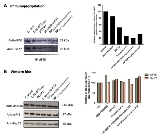 The encapsulated phenazine #14 with DOTAU and DOU-PEG2000 at 100 µM inhibits the interaction of eIF4E/Hsp27. (A) Co-immunoprecipitation of eIF4E showing the interaction of eIF4E and Hsp27, (B) Western Blot analysis showing the expression levels of eIF4E and Hsp27 compared to vinculin.
