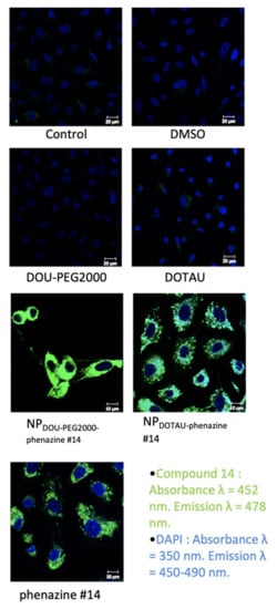 PC-3 cells were seeded into a 12-well plate containing cover glasses covered by FBS, at a density of 100,000 cells/well. Twenty-four hours later, cells were treated with compounds (DMSO, DOU-PEG2000, DOTAU, phenazine #14, NPDOU-PEG2000-phenazine #14, and NPDOTAU-phenazine #14) at 100 µM as indicated above. After 48 h of treatment, cells were washed with PBS1X and fixed with formaldehyde 4% (Thermo Fisher Scientific, Illkrich, France) for 15′ at RT. Subsequently, the cover glasses were washed with PBS 1 × 2 times and mounted on the glass slides using Prolong Gold antifade reagent with DAPI (Life Technologies, Villebon-sur-Yvette, France). The samples were kept to dry in the dark for 24 h, RT, and sealed with nail polish. Images were captured with Zeiss 510 META fluorescence confocal microscope plan 40×/1.4 (Carl Zeiss, Le Pecq, France) for both phenazine #14 (absorption; 452 nm, emission; 478 nm) and DAPI (absorption; 350 nm, emission; 450 nm–490 nm).