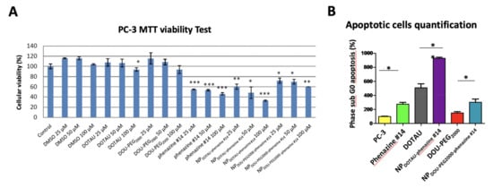 NPDOTAU-phenazine #14 inhibits cell viability and increases apoptosis of PC-3 cells in vitro. (A) MTT (3-(4,5-Dimethylthiazol-2-yl)-2,5-Diphenyltetrazolium Bromide) quantification of PC-3 cell viability was performed on cells treated with NPDOTAU-phenazine #14 and NPDOU-PEG2000-phenazine #14 at different concentrations (25, 50, 100), and NT (control) during 48 h. *, p ≤ 0.1, **, p ≤ 0.01 and ***, p ≤ 0.001. (B) Apoptotic cell quantification (SubG0 phase) by flow cytometry was performed on PC-3 cells treated with the compound NPDOTAU-phenazine #14 and NPDOU-PEG2000-phenazine #14 and NT (Non-Treated cells, control) at 100 µM during 48 h and labeled with propidium iodide. The bar graph represents cell percentage in subG0 phase. *, p ≤ 0.1, **, p ≤ 0.01 and ***, p ≤ 0.001.