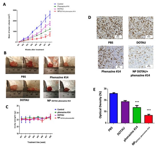 The in vivo test was carried out on mice xenografted with androgen-independent PC-3 prostate cancer cells. DOTAU, phenazine #14, and NPDOTAU-phenazine #14 were administered by i.p. twice a week for 8 weeks. At the end of the experiment after 8 weeks, we observed that 1- DOTAU cargo induced a 30% decrease of tumor growth, 2-phenazine #14 induced a 50% decrease of tumor growth, and 3- formulated NPDOTAU-phenazine #14 induced a 70% decrease of tumor growth. These results were consistent with in vitro experiments. The formulation of the NPDOTAU-phenazine #14 significantly reduced androgen-independent PC-3 tumor growth (n = 8, *** p ≤ 0.01) (Figure 5A,B; Tables S1–S4). The treatment was associated with a very good condition of mice compared to the control arm with no weight loss (Figure 5C). Therefore, no major toxicity is expected but further toxicity experiments would need to be performed prior to any clinical application. The assessment of Ki-67 immunoexpression and optical density in the harvested tumors was correlated with the inhibition of tumor growth (13.7 ± 0.18 for phenazine #14 vs. 6.81 ± 0.14 for NPDOTAU-phenazine #14, p < 0.0001) (Figure 5D,E).