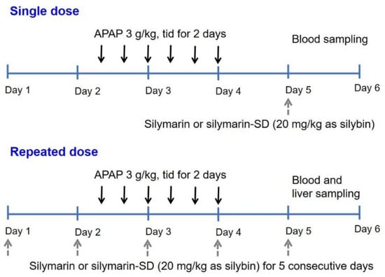 Pharmacokinetics of silymarin following single and repeated oral administration of silymarin and silymarin-SD for 5 days was measured in APAP-induced hepatotoxic rats. To induce hepatotoxicity, rats received an oral dose of APAP (3 g/kg) for 2 days, which was identical to the method described in Section 2.4. The dosing schedule for silymarin or silymarin-SD and APAP is shown in Figure 1.