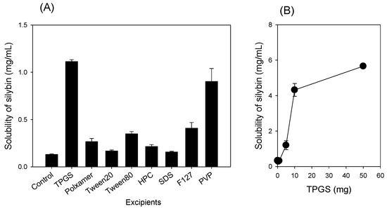 The effect of various excipients, which have been proved for the solubility enhancement of silymarin and for the modulation of efflux transporters in the literature [29,32,33,34], on the silymarin solubility was measured with a silymarin to excipient ratio of 1:1 (w/w). Among the tested excipients, SDS, Tween 20, and HPC increased silymarin solubility by less than 1.5-fold. On the other hand, poloxamer 407, Tween 80, and pluronic F127 increased the silymarin solubility by 2~3-fold. Addition of PVP and TPGS showed the highest increase in silymarin solubility (Figure 2A). Finally, TPGS was selected as an excipient for silymarin formulation based on the previous results that showed TPGS inhibits the efflux transporters including P-gp [30,39,40].