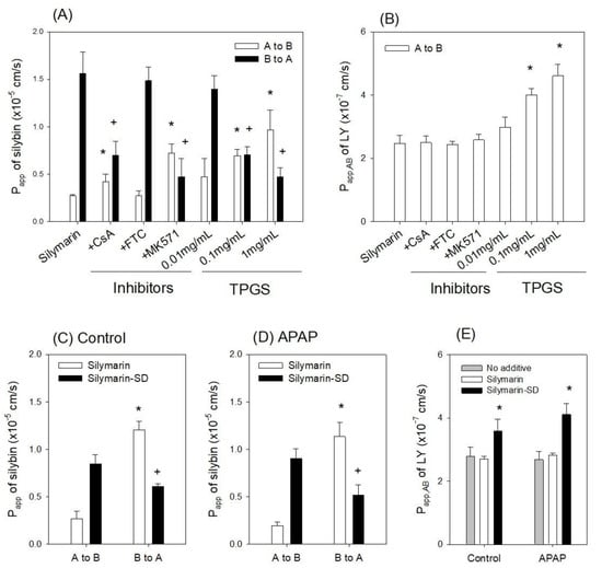 (A) The effect of efflux pump inhibitors and TPGS (0.01 mg/mL–1 mg/mL) on silybin permeability (Papp) in rat jejunal segments. Twenty micromole (20 μM) cyclosporine A (CsA), 20 μM fumitremorgin C (FTC), and 100 μM MK-571 were used as inhibitors of P-gp, BCRP, and MRPs, respectively. (B) The effects of efflux pump inhibitors and TPGS (0.01 mg/mL–1 mg/mL) on A to B permeability (Papp,AB) of Lucifer yellow (LY) in rat jejunal segments. The Papp of silybin in the presence of silymarin and silymarin-SD in jejunal segments from (C) control and (D) APAP-induced hepatotoxic rats. (E) The Papp of LY in the presence of silymarin and silymarin-SD in jejunal segments of control and APAP-induced hepatotoxic rats. Each data point represents the mean ± standard deviation (n = 4). * p < 0.05 compared with A to B Papp of silybin or LY. + p < 0.05 compared with B to A Papp of silybin or LY.
