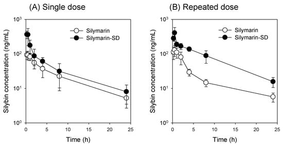 Plasma concentration–time profiles of silybin after (A) single and (B) repeated oral administration for five consecutive days of silymarin (20 mg/kg as silybin) and silymarin-SD (20 mg/kg as silybin) in rats with APAP-induced hepatotoxicity. Treatments followed the dosing schedule (Figure 1). Each data point represents the mean ± standard deviation of four rats per group.
