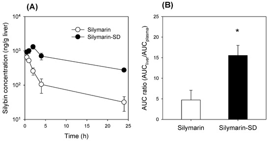 Next, we investigated the liver distribution of silymarin-SD when compared with silymarin itself after repeated oral administration of silymarin-SD. Liver distribution is critical for the therapeutic efficacy of silymarin-SD because hepatoprotective effects of silymarin are mediated by reducing reactive oxygen species and increasing cellular glutathione and superoxide dismutase levels in the liver [8]. The liver concentrations of silybin in the silymarin-SD treatment group were significantly higher than those in the silymarin treatment group (Figure 6A). In addition, the liver silybin concentration in the silymarin group decreased sharply for 4 h, but was maintained for 24 h in the silymarin-SD group (Figure 6A). Therefore, the liver to plasma AUC ratio of silybin was significantly higher in the silymarin-SD than the silymarin group (Figure 6B).