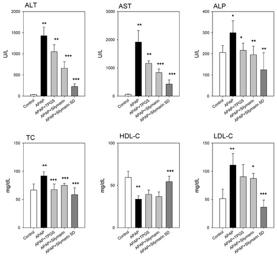 Alanine aminotransferase (ALT), aspartate aminotransferase (AST), alkaline phosphatase (ALP), total cholesterol (TC), high-density lipoprotein-cholesterol (HDL-C), and low-density lipoprotein-cholesterol levels (LDL-C) from control, acetaminophen (APAP)-induced hepatotoxic rat (APAP), APAP-induced hepatotoxic rats treated with TPGS 50 mg/kg (APAP+TPGS), silymarin (20 mg/kg as silybin) (APAP+Silymarin), and silymarin-SD (20 mg/kg as silybin) (APAP+Silymarin-SD). Treatment followed the dosing schedule in Figure 1. Each data represents mean ± standard deviation of four rats per group. * p < 0.05, and ** p < 0.01, compared with silymarin group; + p < 0.05, ++ p < 0.01, and +++ p < 0.001, compared with APAP group.