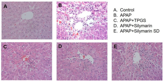 Representative liver histopathology hematoxylin and eosin (400×) images. The effect of silymarin-TPGS on APAP-induced hepatotoxicity in rats. (A) Control rats, (B) acetaminophen (APAP)-induced hepatotoxic rats, (C) APAP-induced hepatotoxic rats treated with TPGS (50 mg/kg) (APAP + TPGS), (D) APAP-induced hepatotoxic rats treated with silymarin (20 mg/kg as silybin) (APAP + silymarin), and (E) APAP-induced hepatotoxic rats treated with silymarin-SD (20 mg/kg as silybin) (APAP + silymarin-SD). Treatments followed the dosing schedule (Figure 1).