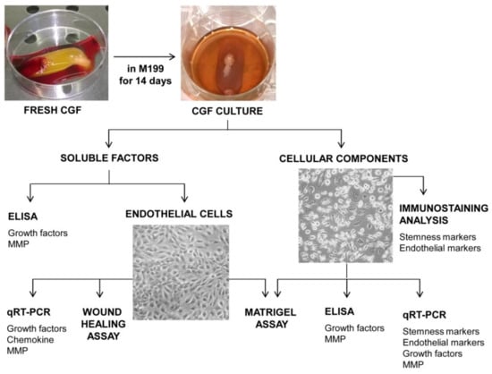 Venous blood (8 mL) from 5 healthy, non-smoking adult donors, two females and three males, aged between 27 and 50 years old, was collected and immediately centrifuged by a Medifuge device (Medifuge MF200; Silfradent srl, Forlì, Italy), at 25 °C, using a program with the following characteristics: 30 s acceleration, 2 min 2700 rpm, 4 min 2400 rpm, 4 min 2700 rpm, 3 min 3000 rpm, and 36 s deceleration and stop, to obtain CGF clot, as previously described [36,38]. Informed consent was obtained from the donors included in this study in accordance with Declaration of Helsinki. For each set of experiments, CGFs were prepared from the same blood sample of a single donor. To remove excess serum, CGF clot was washed with phosphate-buffered saline (PBS) and cultured in sterile dish with 2 mL of M199 medium at 37 °C in a humidified atmosphere with 5% CO2 for 14 days. Then, CGF clot was removed, and CGF-conditioned medium (CGF-CM) was collected and centrifuged at 1500 rpm for 10 min. Then, the supernatant was stored at −80 °C until use, and the pellet was used for the CGF cell culture. In particular, CGF-CM was analyzed to evaluate the content of growth factors and metalloproteinases and its effects on the angiogenesis of human endothelial cells (Figure 1).