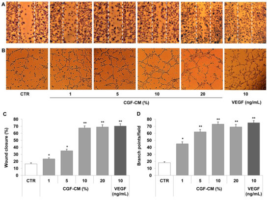 CGFs promote endothelial cell migration and tube formation. A scratch wound was performed on endothelial monolayers of HMEC-1 that were stimulated with CGF-CM (1%, 5%, 10% or 20%) for 16 h (A). Cell migration was quantified and monitored under phase-contrast microscopy (C). HMEC-1 cells were plated onto a three-dimensional collagen gel (Matrigel) surface and then stimulated with CGF-CM (1%, 5%, 10%, or 20%) or VEGF (10 ng/mL) for 16 h (B,D). Tube formation was monitored under phase-contrast microscopy, photographed, and analyzed. Images are representative of cell migration (A) and capillary-like tube formation (×100 magnification) (B). Data are representative of three independent experiments, expressed as means ± SD, and presented as percentage of wound closure (C) and branch points per field (D). Each experiment consisted of four replicates for each condition. * p < 0.05 and ** p < 0.01 vs. control (CTR).