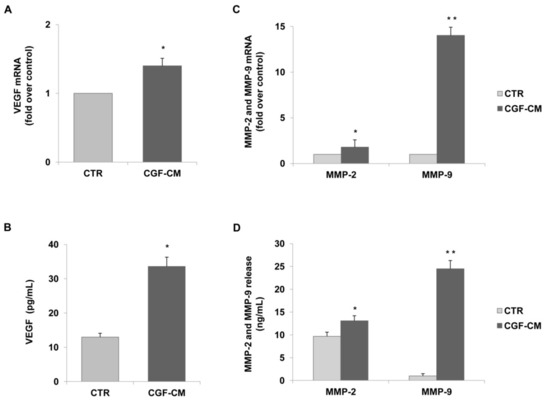 CGFs induce the expression and release of VEGF and matrix metalloproteinases in endothelial cells. HUVECs were incubated with CGF-CM (10%) or culture medium (CTR) for 4 h and mRNA levels of VEGF. (A) MMP-9 and MMP-2 (C) were analyzed by qRT-PCR and expressed as fold over unstimulated control (CTR) (mean ± SD). HUVECs were incubated with CGF-CM (10%) or culture medium (CTR) for 4 h, and then culture media were removed and replaced with fresh media for 48 h. Media were collected, and VEGF (B), MMP-9, and MMP-2 (D) concentrations were analyzed by ELISA. Data are representative of three independent experiments, expressed as means ± SD. Each experiment consisted of four replicates for each condition. * p < 0.05 and ** p < 0.01 vs. control (CTR).
