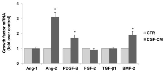 CGFs enhance the expression of pro-angiogenic factors in endothelial cells. HUVECs were incubated with CGF-CM (10%) or culture medium (CTR) for 4 hm and mRNA levels of Ang-1, Ang-2, PDGF-B, FGF-2, TGF-β1, and BMP-2 were analyzed by qRT-PCR and expressed as fold over unstimulated control (CTR) (mean ± SD). Each experiment consisted of four replicates for each condition. * p < 0.05 vs. CTR.